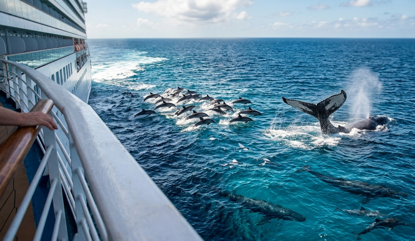 One of the most rewarding aspects of a voyage is the silent anticipation of spotting the ocean's inhabitants. From the high vantage point of the deck, you might see a pod of dolphins dancing in the ship’s wake or the distant, majestic spray of a whale breaching the surface. Watching the sunlight catch the silver flash of flying fish as they glide over the crests or observing a lone sea turtle in the tropical shallows creates a profound connection to the living world beneath the waves. These fleeting, unscripted moments , remind us that we are merely guests in a vast, vibrant blue wilderness.